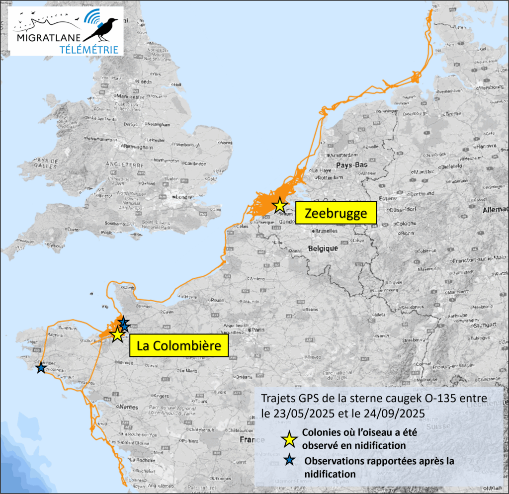 La sterne caugek « Orange-135 », ci-après nommée O-135, d’après la bague gravée qu’elle porte à la patte droite, a été capturée sur son nid et baguée le 23 mai 2025 sur l’îlot breton de la Colombière, au large de Saint-Jacut-de-la-mer (22). Cette sterne, ainsi qu’une dizaine d’autres, a été équipée d’un GPS permettant de la suivre à la trace. Suite à cette manipulation réalisée par des bagueurs et bagueuses professionnel.le.s* elle est retournée couver ses 2 œufs.