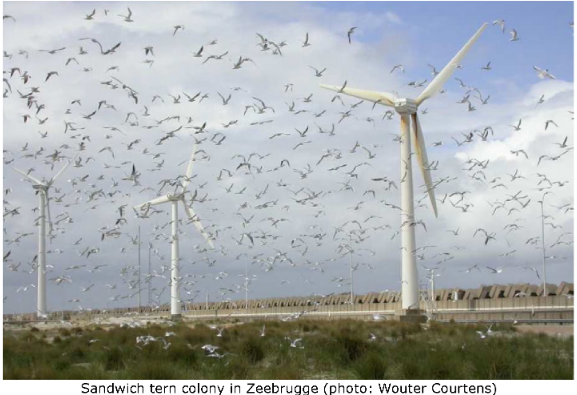 Cependant, O-135 a choisi une colonie très particulière. En effet, le port de Zeebruges abrite aussi une colonie d’éoliennes dites semi-offshore car construites en partie sur une grande digue à la mer. Le site de nidification des sternes est une péninsule artificielle créé en 2004 dans le cadre des compensations environnementales liées au développement de l’éolien sur ce secteur qui a provoqué une destruction d’habitat. Ce site de nidification pour sternes et laridés a été créé presque directement sous les éoliennes.