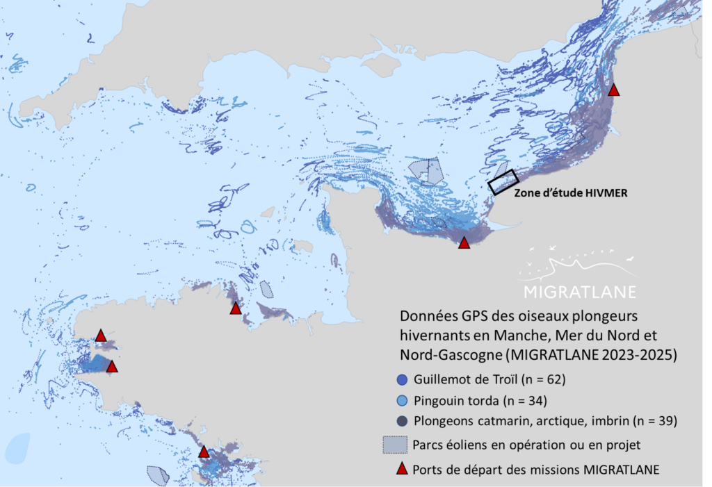 Trajectoires GPS des oiseaux hivernants plongeurs équipés de balises dans le cadre du programme MIGRATLANE entre 2023 et 2025 et zone d’étude du nouveau projet HIVMER.