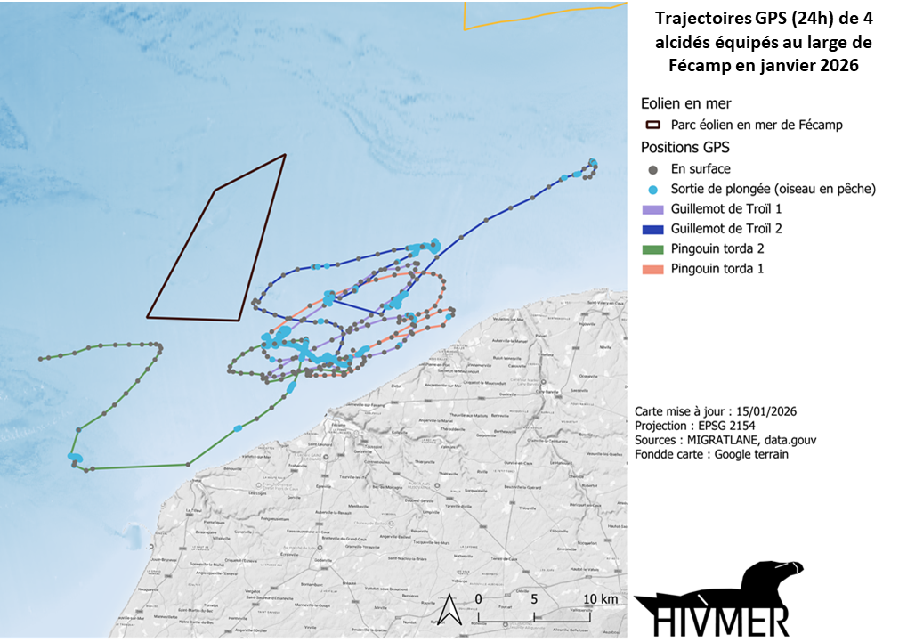 Trajectoires GPS sur 24 heures de 4 alcidés, 2 pingouins et 2 guillemots, équipés de balise GPS au large de Fécamp le 13/01/2026. Les points bleus correspondent à des positions en fin de plongée lorsque les oiseaux sont en pêche.